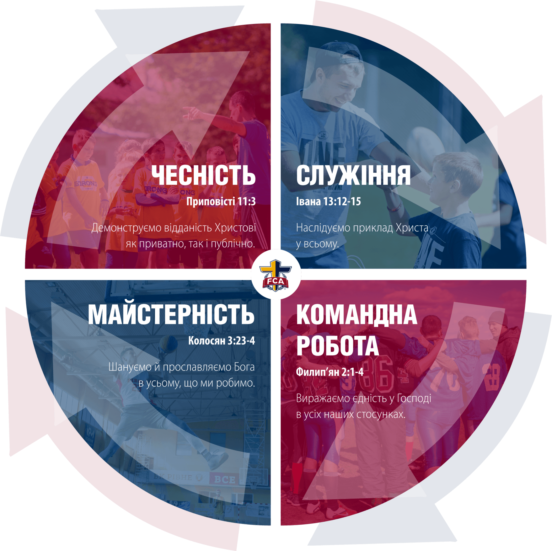 Ми залучаємо, споряджаємо і задіюємо тренерів і спортсменів, прагнучи допомогти їм стати учнями Христа, щоб вони пізнали Його і зростали у Ньому, і допомагали іншим ставати учнями Христа.